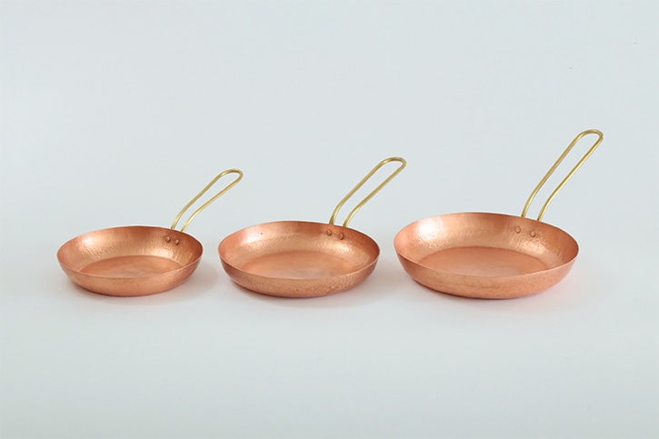 「銅フライパン」に使われている銅は、一般的なフライパンに使われている金属としては、最も熱伝導性がいい部類の素材。熱が素早く入り、熱ムラが少なく均一に火が入るのがいいところ。