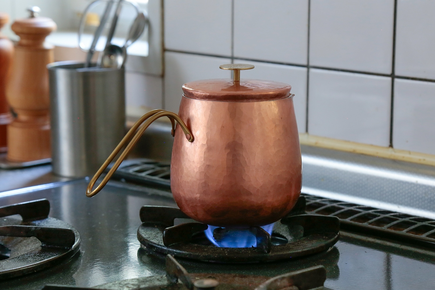 手打ちで叩いてかたちづくる銅製の台所道具を中心に製作。