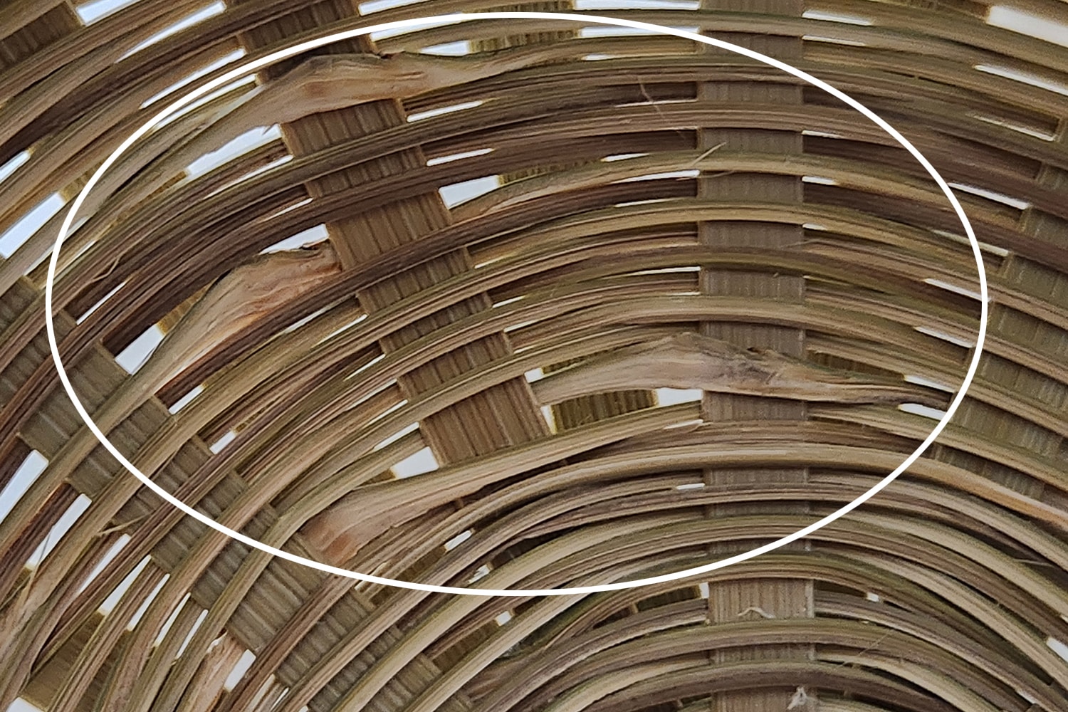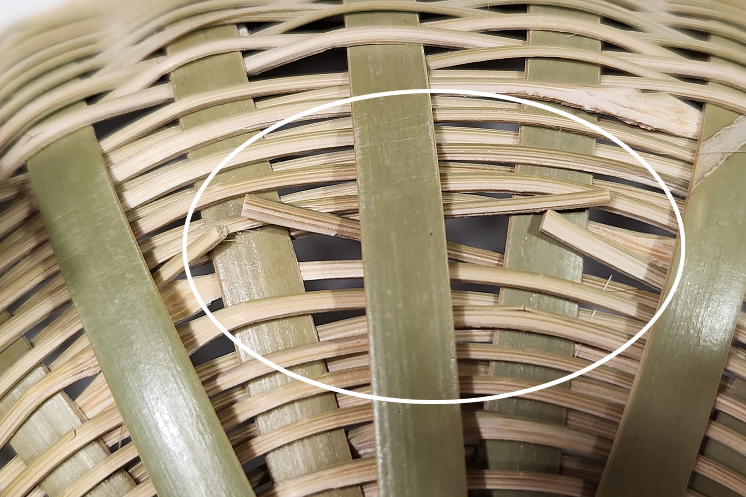 底は、菊の花のように放射状に太い竹ひごを交差させ、蜘蛛の巣のように中心から外側に向かって編んでいく「菊底編み」で丈夫に編み上げられています。