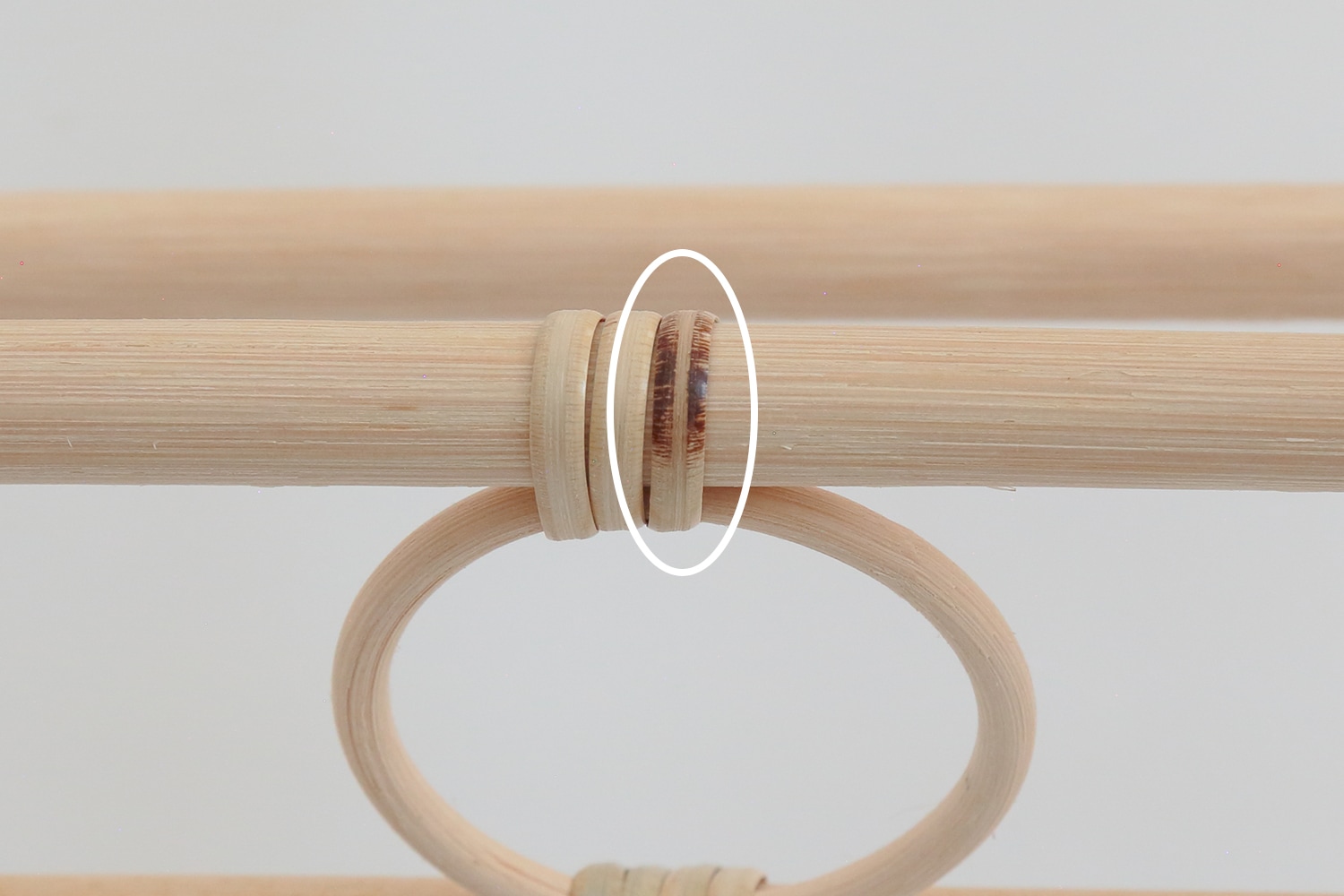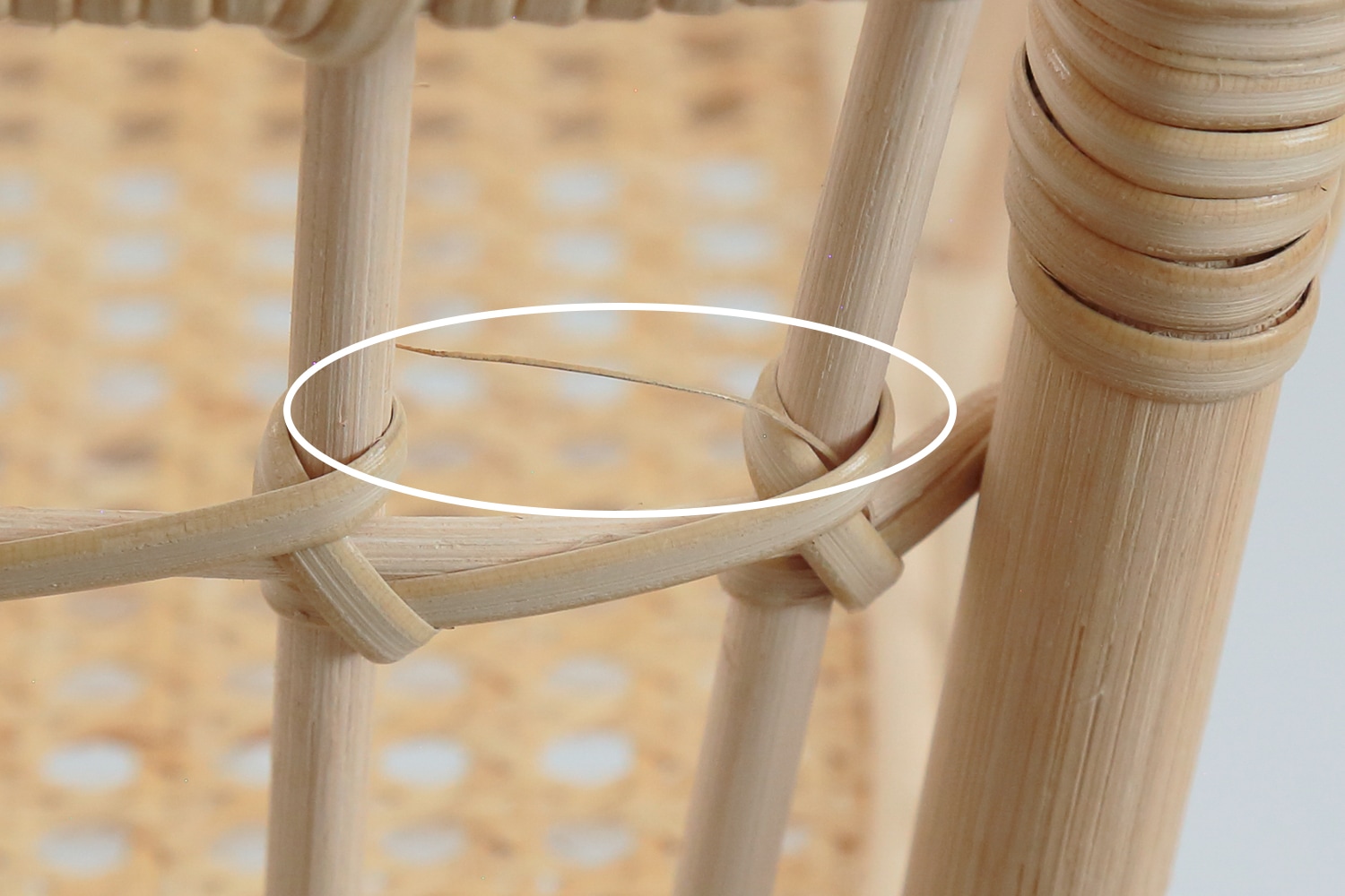 かごの縁部分には、表皮を剥いた籐ひごが隙間なく巻かれています。